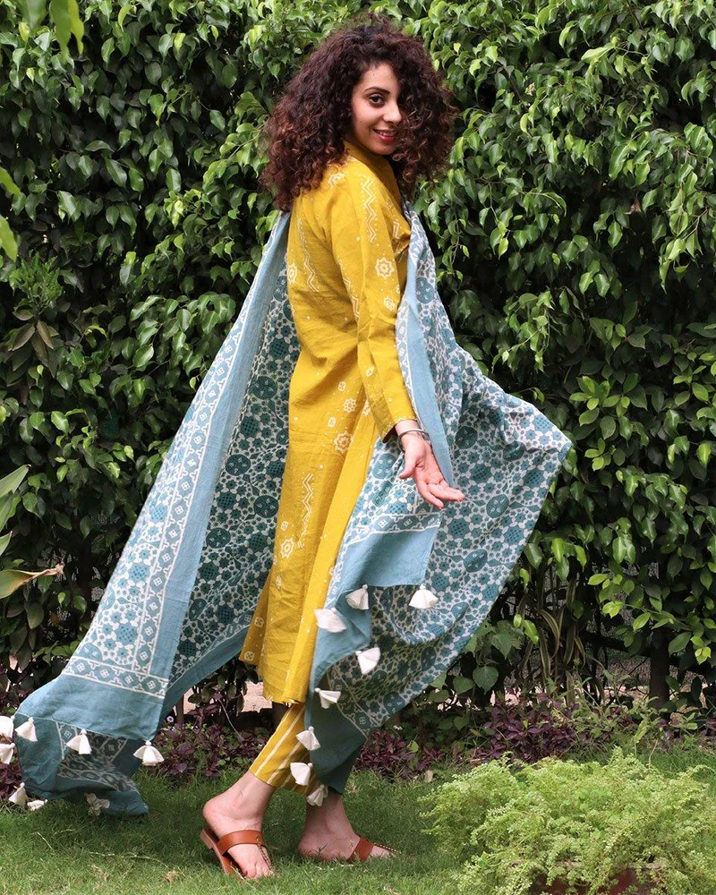 Introducing our Ivory Block Printed Kurta Set, a blend of tradition and modernity. The set features a delicate white block print on an ivory base. The collared neck and three-fourth sleeves add elegance and comfort. The front top buttons enhance the aesthetic appeal. Paired with a vibrant yellow pant for a stylish ensemble.